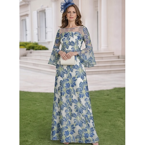 Linea ad A Lunghezza al pavimento Abito da invitata a nozze Largo Abito da cerimonia per signora Manica 3/4 Scollo Illusione Scollo a Barca Elegante Vintage Formale Ospite di nozze Serata Formale