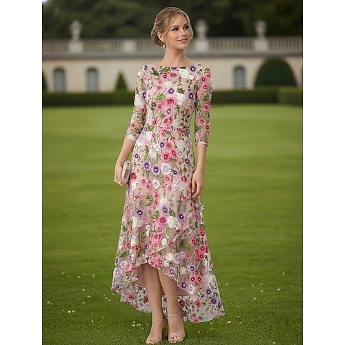 Linea ad A Abito Abito alto-basso Lunghezza alla caviglia Abito da Cocktail Abito da cerimonia per signora Manica 3/4 Scollo a Barca Elegante Semplice Formale Ospite di nozze Semi-Formale con Volant