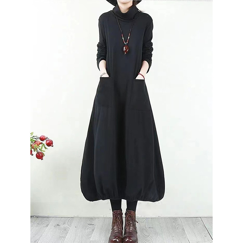 Women's Black Dress Long Dress Maxi Dress Polyester Ruched Pocket Daily Date Active Fashion Turtleneck Long Sleeve Black Wine Khaki Color