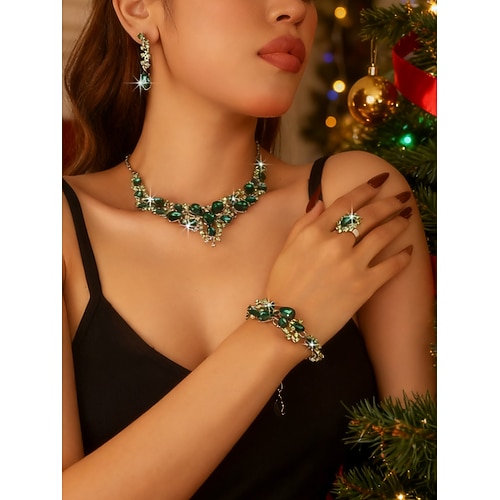 Damen grün Kristall Schmuck-Set 4-teilig, elegante Halskette, Ohrringe, Armband Ring für Weihnachtsfeiern, Weihnachtsgeschenke formelle Veranstaltungen