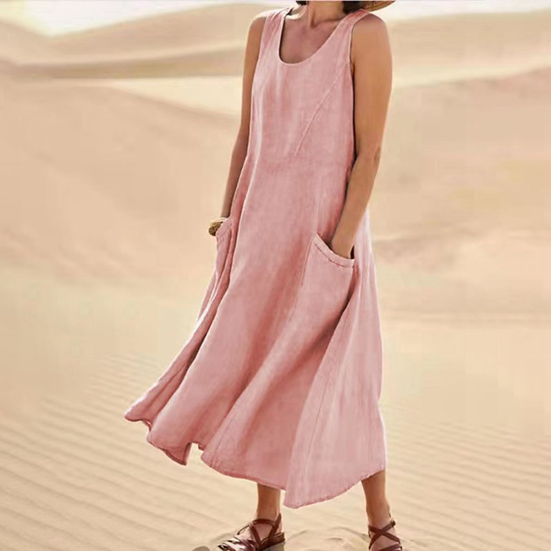 Women's Midi Dress 100% Cotton Cotton Linen Dresses Fashion Classic Vacation Going out Weekend Regular Fit Plain Sleeveless Crew Neck White Pink Orange Khaki Summer