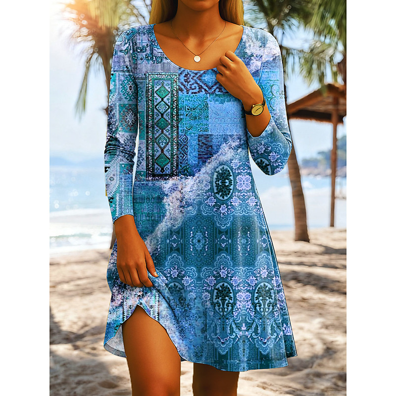 Women's Knee Length Dress T Shirt Dress Tee Dress A Line Dress Casual Regular Fit Graphic Boho Paisley Damask Long Sleeve Crew Neck Scoop Neck Blue Pink Orange Green Spring Fall Winter