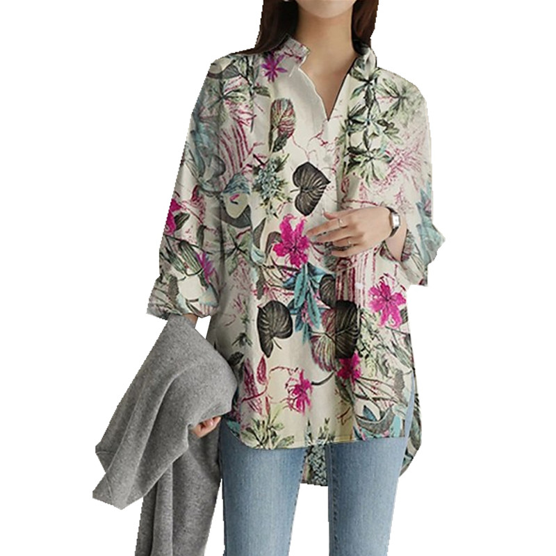 Women's Boho Shirts Faux Cotton Linen Royal Blue Purple Khaki Toile Floral Print Pocket Home Party Elegant Neutral Daily Shirt Collar Cotton Linen Loose Fit S