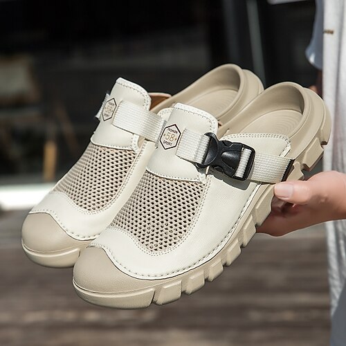 Sandali da pescatore da uomo beige, a punta chiusa, con cinturino posteriore, scarpe estive casual, leggere e comode, ideali per viaggi, vacanze, resort e tempo libero quotidiano.