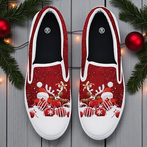scarpe da donna rosse slip-on natalizie con gatto che indossa un cappello da Babbo Natale: stile natalizio divertente, calzature casual comode e calde per feste di Natale e regali