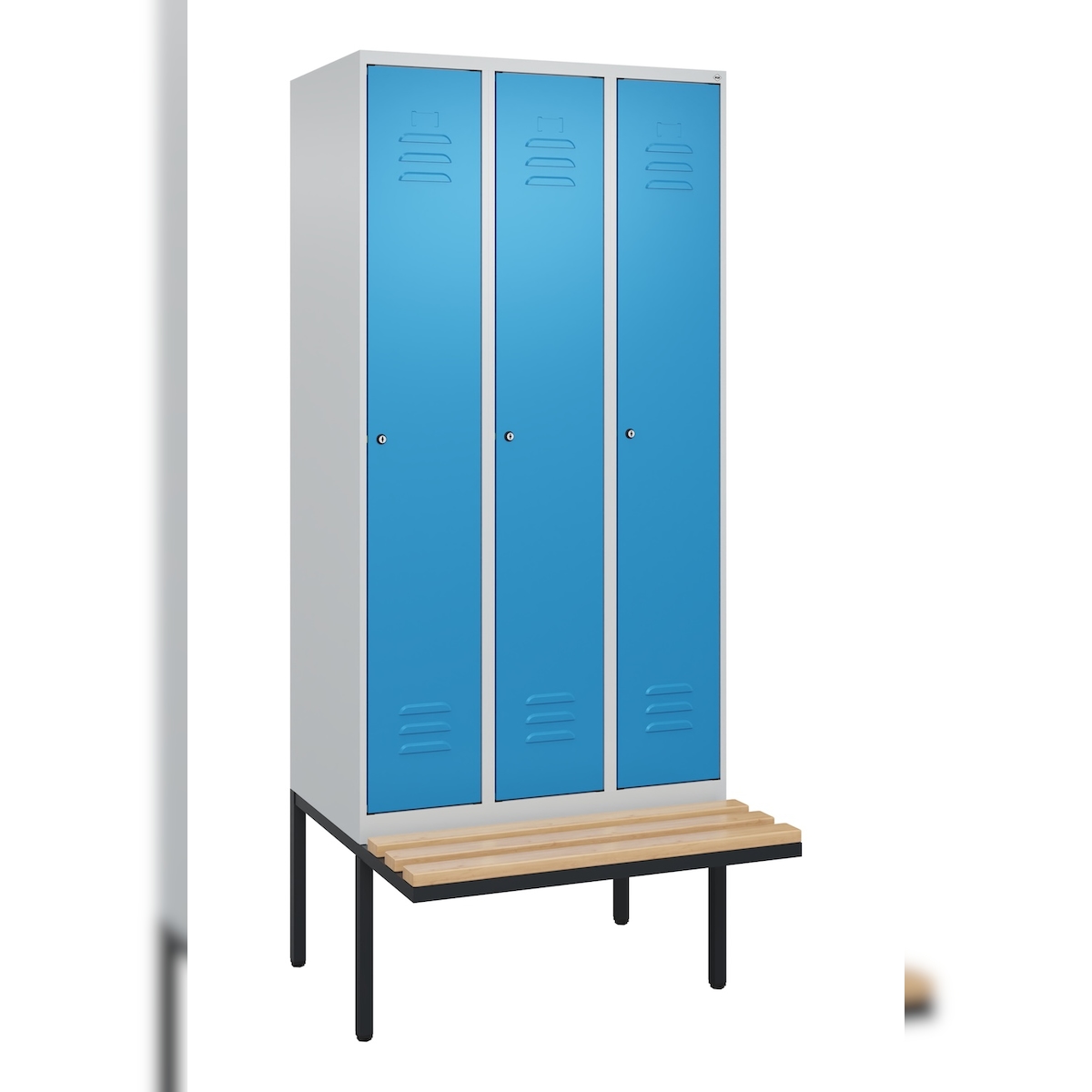 C+P Spind Classic PLUS, schwebender Sitzbank aus Buche 3 Abteile, HxBxT 212x90x82cm, Sicherheitsdrehriegel, Hellgrau/Fernblau von PROREGAL
