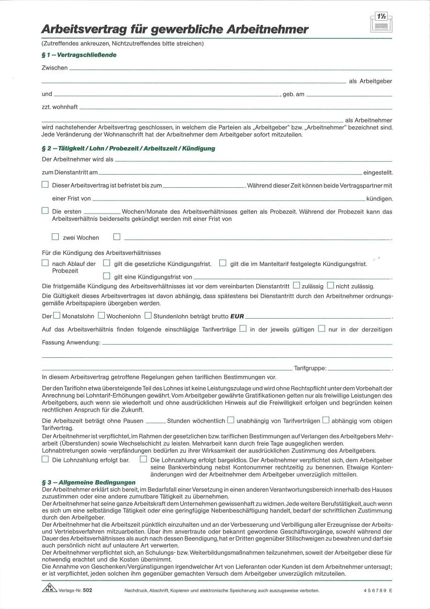 RNK Arbeitsvertrag für gewerbliche Arbeitnehmer A4 VE=10 Stück