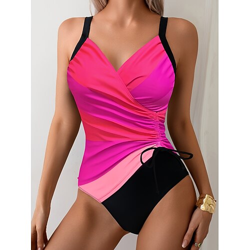 Costume da bagno intero da donna snellente arricciato colorblock monokini controllo della pancia vita alta schiena scoperta vacanze al mare ombre scollo a V senza maniche