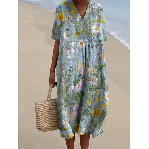 Per donna Abito Midi Abito Floreale Abito Stampato Moda Moderno All'aperto Vacanza Uscire Vestibilità comoda Floreale Manica Corta Scollo a V Blu Verde chiaro Verde militare Rosso Estate Primavera