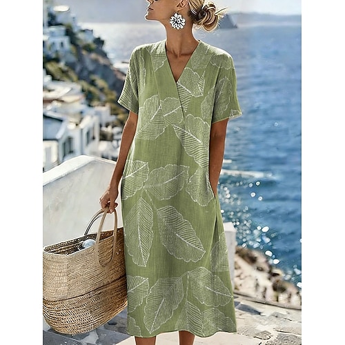 Per donna Abito Midi Vestito Casual Vestito Estivo Vacanza Casual Spiaggia Spiaggia Feste Vestibilità comoda Grafico Foglia Geometrico Manica Corta Scollo a V Blu Verde Estate Primavera