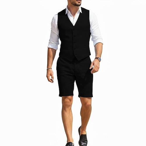 gilet in lino da uomo per feste e matrimoni in spiaggia pantaloncini leggeri scollo a V nero bianco casual tinta unita vestibilità slim 2 pezzi monopetto cinque bottoni