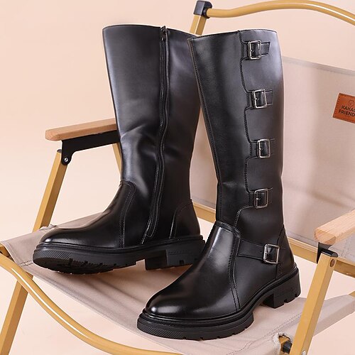 stivali da motociclista da uomo alti fino al ginocchio robuste scarpe invernali da equitazione in pelle nera con fibbie