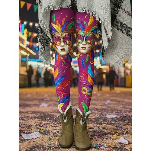 Karnevals-Leggings für Damen, bequeme Leggings im Vintage-Ethno-Stil, lange Hose mit hohem Bund, Grafikprint, bequem, dehnbar, lässig, für Alltag und Urlaub, tiefes Lila, Marineblau, Fuchsia