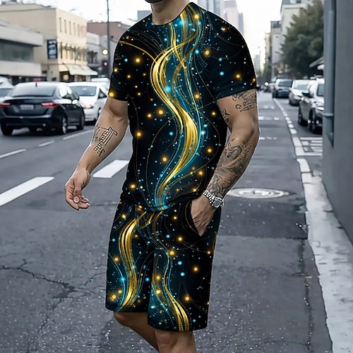 Herren Geometrisch Linie 2St T-Shirts-Sets Sommeroberteile Kurzarm Kurze Hosen Rundhalsausschnitt Sport Alltagstauglich Täglich Urlaub 3D-Druck Sommer Blau Rote Grün