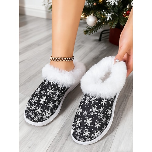 pantofole da donna con stampa a fiocco di neve e slip-on per le feste - scarpe slip-on rosse festive con pelliccia sintetica bianca per il comfort invernale, perfette per la mattina di Natale e per l'abbigliamento casual