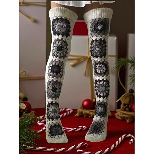 calzini lunghi fino al ginocchio da donna all'uncinetto con motivo granny square a tema natalizio, design lavorato a maglia multicolore per le feste e la moda invernale