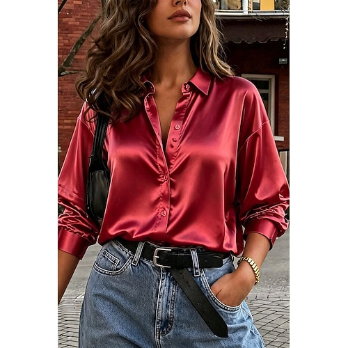 Per donna Camicia Top in raso Blusa Top Eleganti Arricciato Bottoni Drappeggiato Tinta unica Semplice Elegante Vintage Signore Manica Lunga Colletto a Camicia Top Regolari Casuale Quotidiano Lavoro
