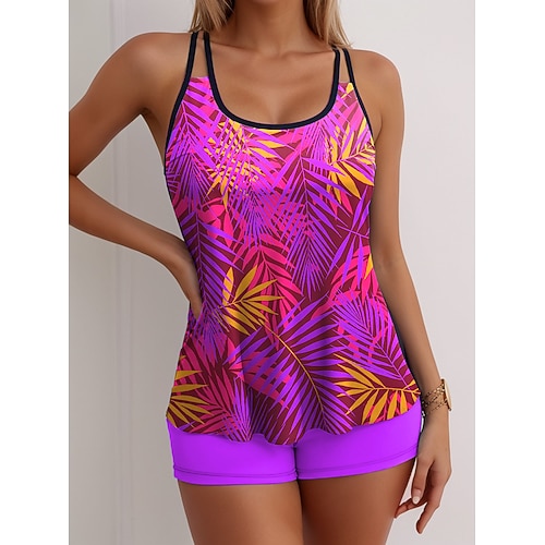 Costume da bagno tankini da donna 2 pezzi palma vita alta senza schienale vacanza spiaggia abbigliamento grafico geometrico scollo a barchetta senza maniche
