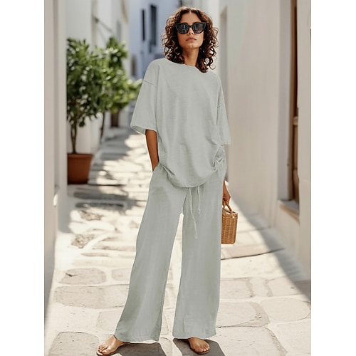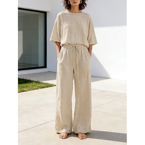 Completo pantaloni da donna in lino al 15%, completo in lino, tinta unita, tasca, elastico in vita, t-shirt, pantalone, casual, a maniche lunghe, girocollo, blu, nero, bianco, blu navy, marrone chiaro, estate, primavera