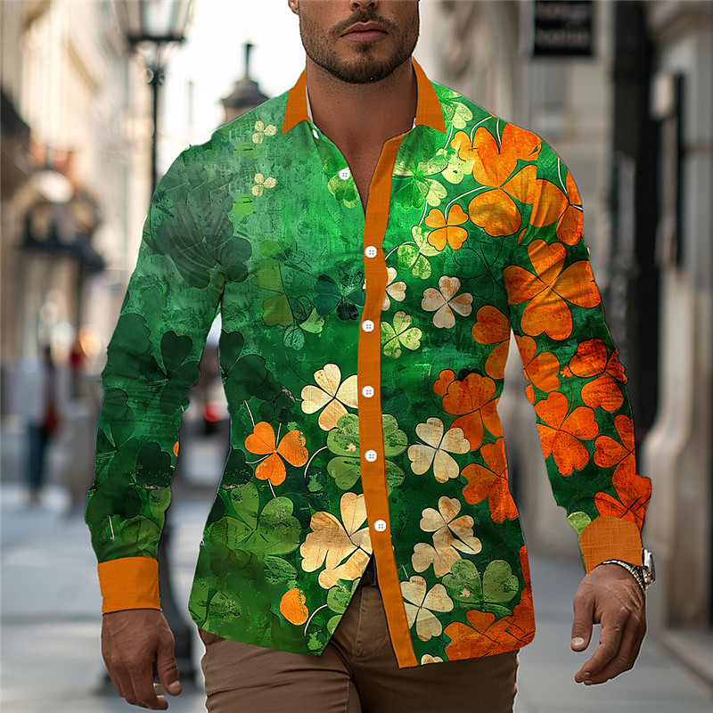 Four Leaf Clover Men's Fashion casual 3D Printed Shirt Shirt Holiday Vacation Festival Spring Summer Turndown Long Sleeve Orange S M L Shirt St. Patrick