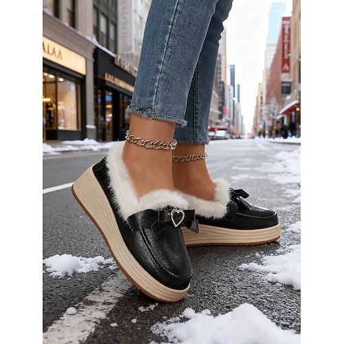 mocassini beige da donna con fodera in pelliccia sintetica e fiocco, comode scarpe slip-on con ciondolo in metallo a forma di cuore, eleganti calzature invernali per un uso casual e quotidiano