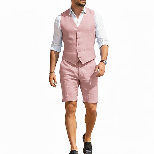gilet in lino da uomo per feste e matrimoni in spiaggia pantaloncini leggeri scollo a V nero bianco casual tinta unita vestibilità slim 2 pezzi monopetto cinque bottoni
