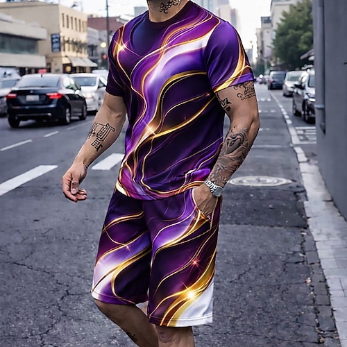 Herren Geometrisch 2St T-Shirts-Sets Sommeroberteile Kurzarm Kurze Hosen Rundhalsausschnitt Lässig Trendy Streetstyle Lässig Täglich Urlaub 3D-Druck Sommer Blau Rote Purpur