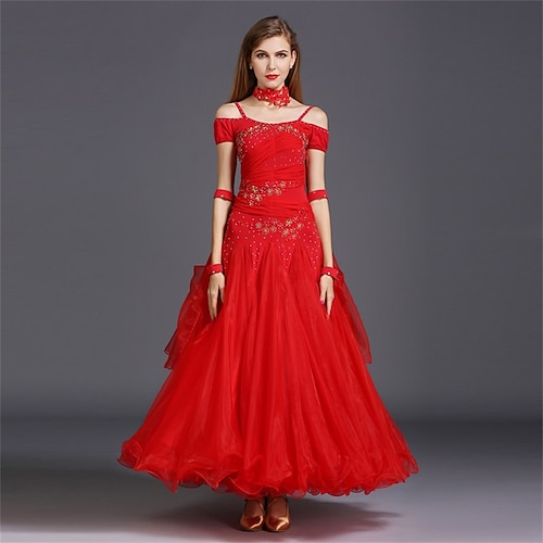 elegante abito da ballo latino da donna con scollo all'americana, design in rete di strass, abito da competizione per tango e valzer – rosso