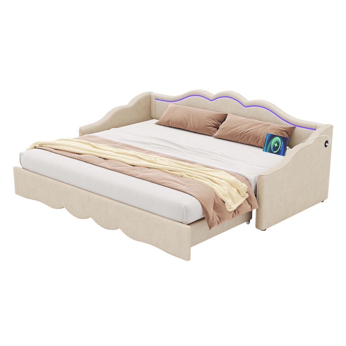 Merax Polsterbett 90x200 cm, ausziehbares Daybett/Sofabett auf 180x200 cm, 2-in-1 Einzel- & Doppelbett, mit LED & USB-Anschluss, Samt-Bezug, Beige