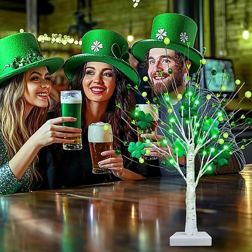 Albero luminoso di San Patrizio con 24 luci LED verdi, a batteria, trifoglio, bacche, decorazione per San Patrizio, ornamento per l'atmosfera della festa in casa
