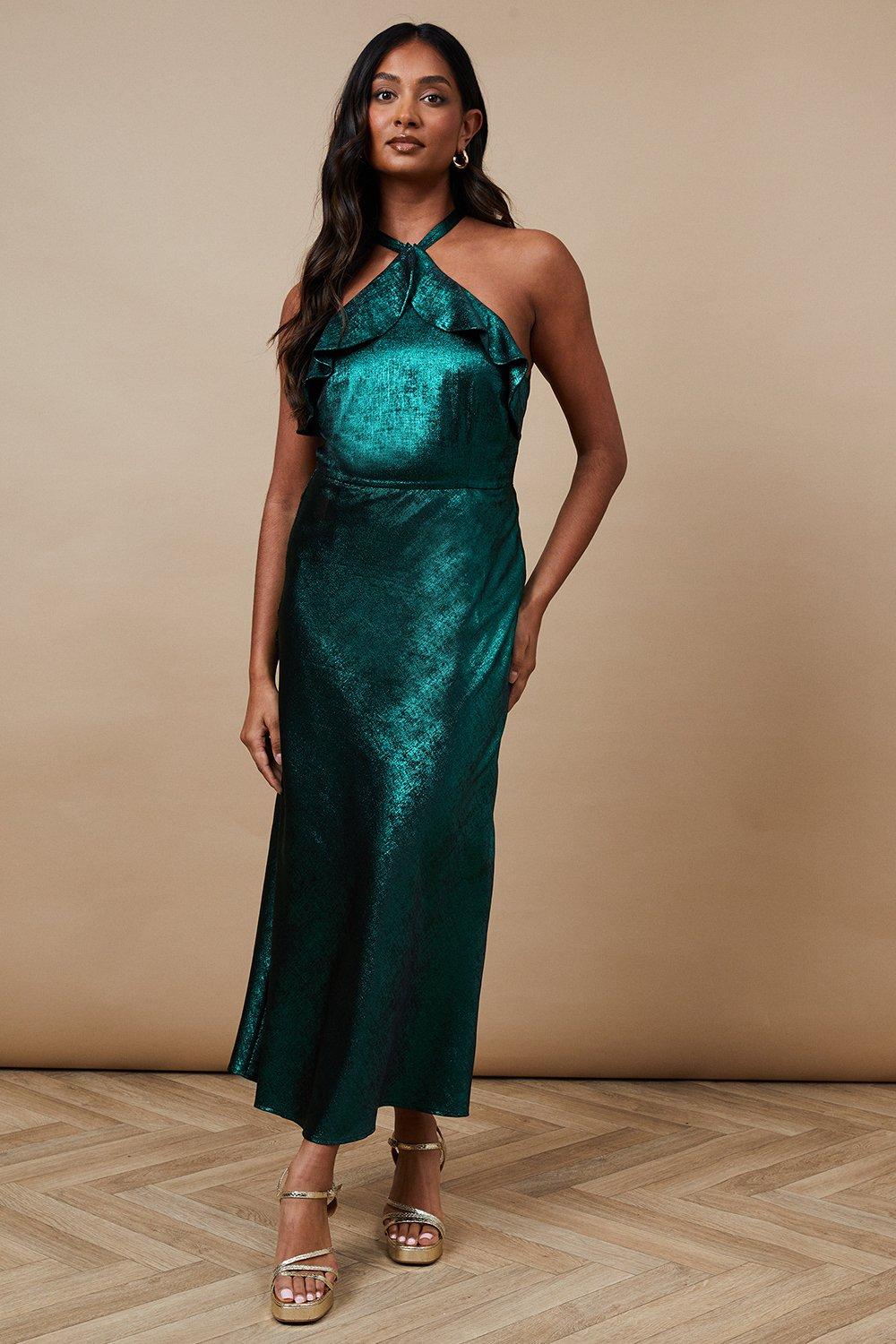 Oasis Womens Foil Halterneck Ruffle Midaxi Dress - Green - Size 6 UK | Oasis Sale | Discount Designer Brands