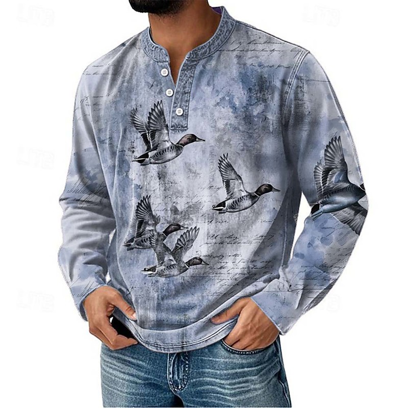 Men's Graphic Bird Henley Shirt T shirt Tee Long Sleeve Fashion Daily Retro Vintage Casual Holiday Going out Spring Fall Light Blue Purple Khaki Gray Henley Henley T-Shirt