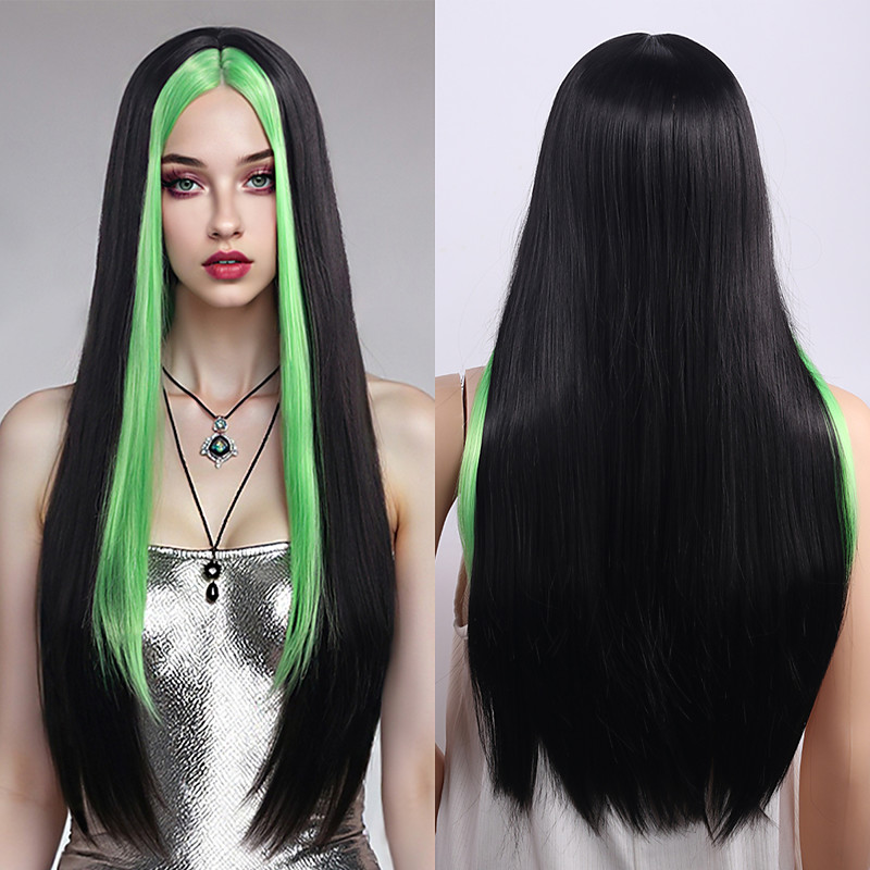 Gothic Black and Green Highlight Wig Long Straight Synthetic Hair for Women Emo Punk Cosplay Party Daily Wear