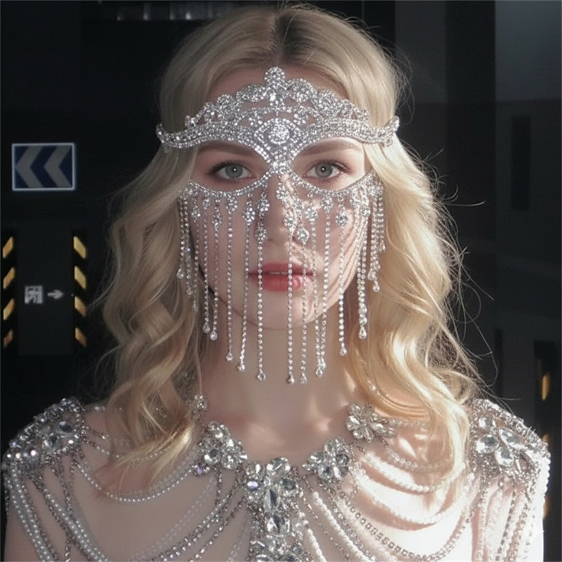 Rio Carnival Samba Accessories Sparkling Rhinestone Masquerade Mask - Crystal Draping Face Veil, Halloween Costume Accessory, Rave Festival Party Headpiece Brazil Festival Performance Costume