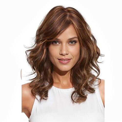 Mittelbraune, gewellte Perücke für Damen mit Strähnchen, schulterlang, natürlich aussehendes, realistisches Kunsthaar, hitzebeständig, Seitenscheitel, eleganter Alltagsmode-Stil