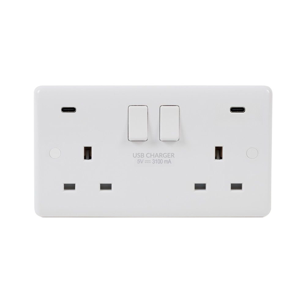Soho Lighting White Metal Flat Plate 2 Gang 65W USB C+C Socket (13A Socket + 2 USB C Ports) - Size: 86mm x 146mm x 4.5mm