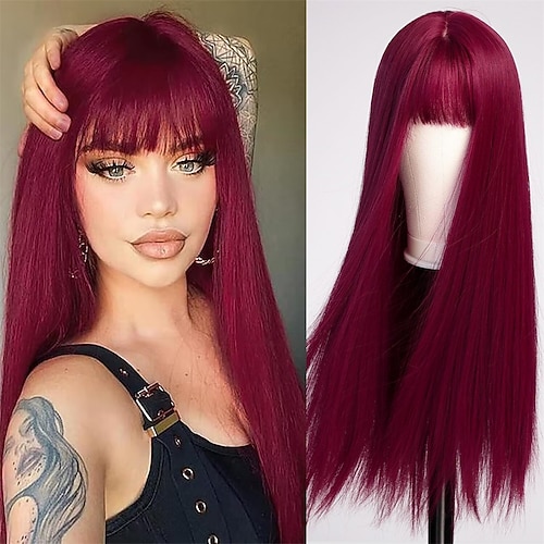 parrucche rosse con frangia parrucca lunga dritta sintetica rosso bordeaux per feste da donna e parrucca rosso brillante cosplay