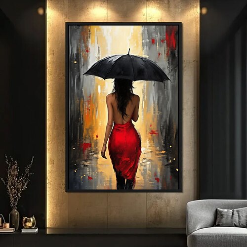 dipinto a olio fatto a mano elegante donna sexy in abito rosso con ombrello dipinto su tela romantico giorno di pioggia arte murale per camera da letto o soggiorno arredamento