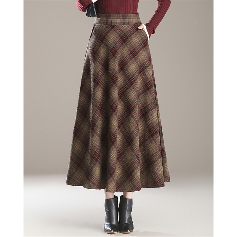 Women's Plaid Skirt Long Skirt Elegant Retro Vintage Maxi High Waist Skirts Plaid Color Block Pocket Long Micro-elastic Daily Casual Daily Red Khaki Fall 100% Polyester