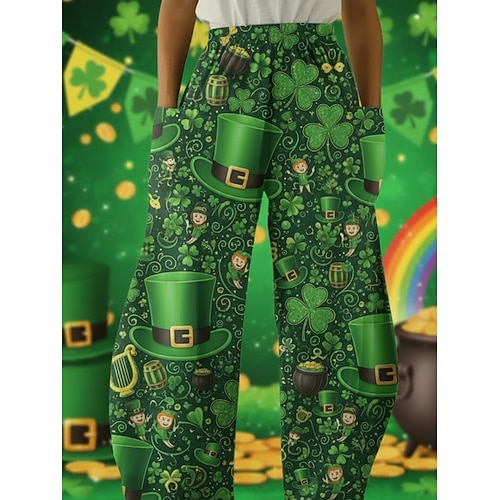 St. Patrick's Day Damen-Freizeithose mit weitem Bein, hoher Bund, Kleeblatt-Print, Kordelzug, Tasche, elastischem Bund, bequem, atmungsaktiv, dehnbar, ideal für den Alltag.