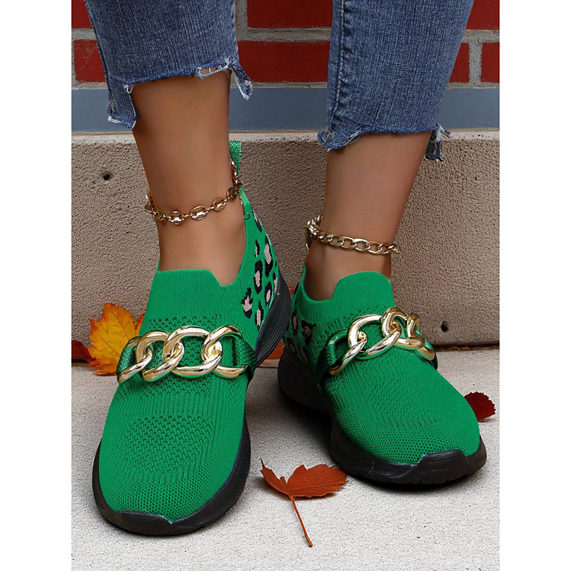 Women's Orange Flyknit Slip-On Sneakers with Leopard Print Chain Detail – Trendy Chunky Sole Shoes for Halloween, Festivals Streetwear