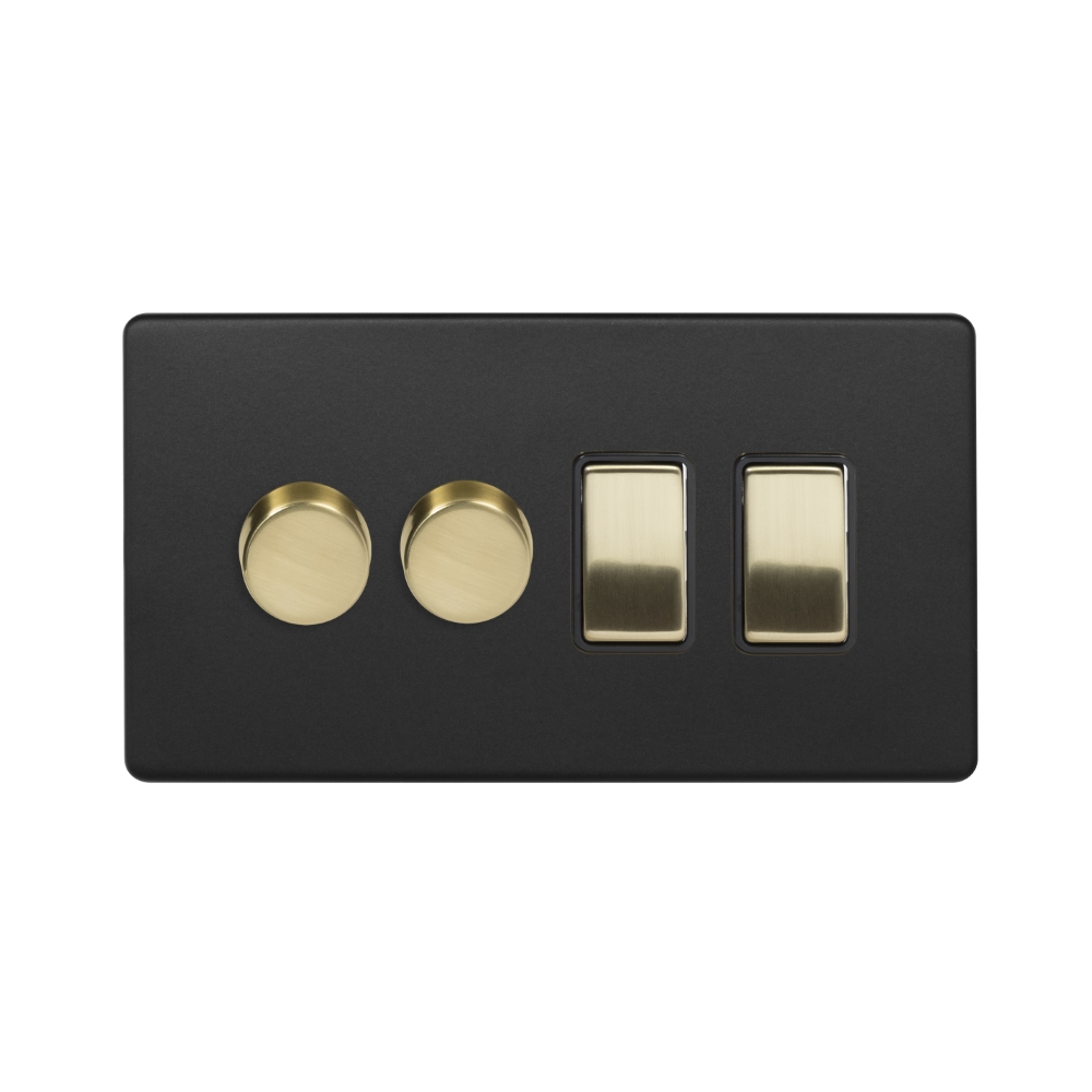 Soho Lighting Matt Black & Brushed Brass 4 Gang Dimmer and Rocker Switch Combo (2 x 2-Way intelligent Dimmer & 2 x 2-Way Switch)