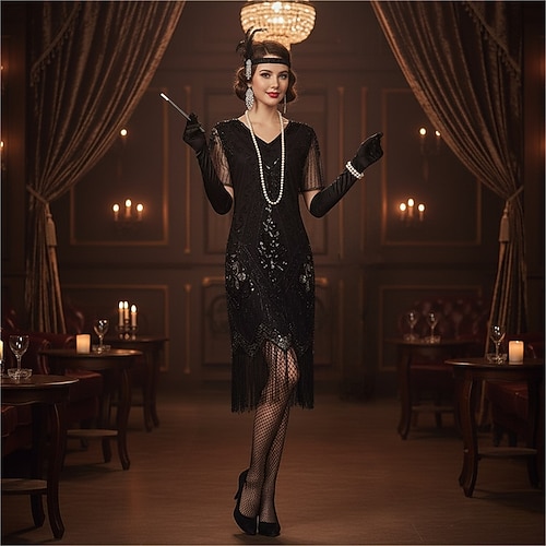 Set Retrò Vintage Anni Ruggenti Anni 1920 Lunghezza al ginocchio Abito Flapper Abito da cocktail Costume di fantasia con accessori Maniche corte Il grande Gatsby Ragazza Flapper Paillettes Frangia