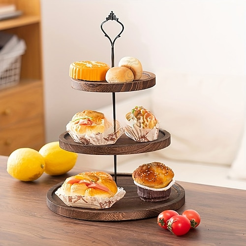 Alzata per torta multistrato in legno massello a 3 piani vassoio da dessert in ferro battuto con gamba alta Espositore per dolciumi, vassoio di frutta, espositore rotondo in legno di acacia,