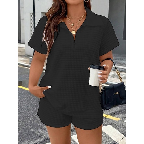Per donna Set da due pezzi Set di Pantaloncini Manica Corta Colletto a Camicia Semplice Cerniera Moda Streetwear Casuale Quotidiano All'aperto Nero Bianco Estate Vestibilità regolare