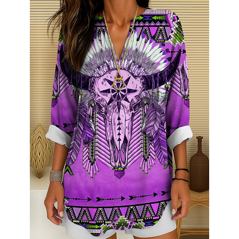 Women's Blouse Tunic V Neck Long Sleeve Boho Casual Tops Graphic Geometric Skull Bohemia Vintage Tropical Regular Tops Daily Wear Print Yellow Red Blue Purple Green