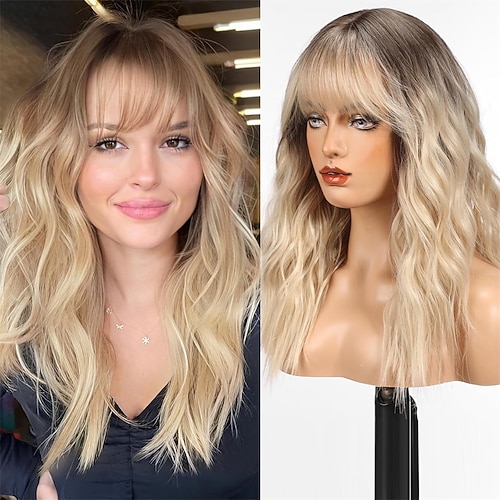 lange Perücke mit Pony, synthetische gewellte Perücken für Frauen, hellblond mit Strähnchen