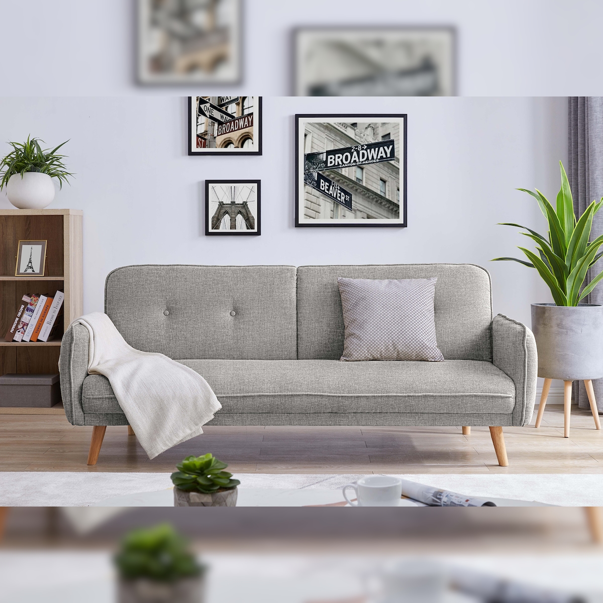 SalesFever Sofa 3-Sitzer | mit Schlaffunktion | Bezug Strukturstoff | Beine Hevea-Holz | B 188 x T 85 x H 80 cm | hellgrau – natur