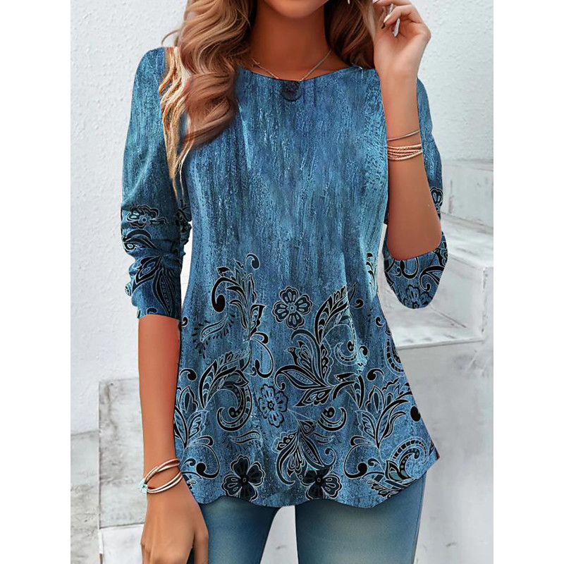 Women's T shirt Long Sleeve Crew Neck Long Sleeve Tunic Geometric Vintage Casual Regular Tops Daily Print Navy Blue Spring Fall Prefall