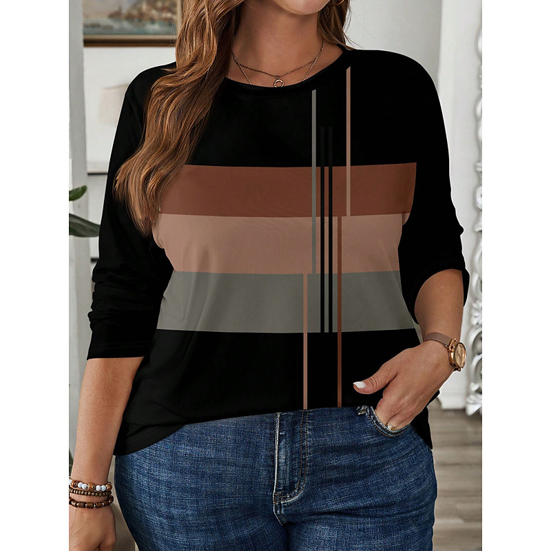 Women's Plus Size Tops T Shirt Geometry Print Long Sleeve Crew Neck Casual Daily Polyester Fall Winter Blue Brown